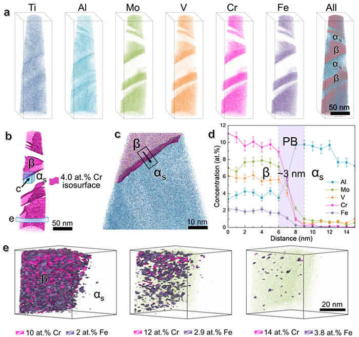 這種極致的強度-塑性性能主要得益于精心設計的“納米孿生α析出相+超細β亞晶”微觀組織結構(圖2)。其中,由ω前驅體介導的高密度納米級α析出相不僅具有顯著的強化效應,而且α相之間形成孿生對,通過共格孿晶界有效緩解半共格α/β界面的應變不相容性,進而提高塑性。同時,超細β亞晶界扮演多重功能:除了在塑性變形過程中阻礙位錯運動并協調塑性變形,在時效過程中β亞晶界促進非連續的納米α片析出。與傳統β晶界處析出的連續晶界α膜不同,這種非連續的亞晶界納米α片不僅可以作為位錯源發射位錯促進塑性變形,還可以阻礙位錯滑移以增加應變硬化率提高均勻延伸率。塑性變形過程中,高應力驅動的化學異質性(圖3)能夠與位錯產生強烈的相互作用,使位錯運動變得“遲緩”,增加位錯間交互作用的機會,這有利于提高材料的加工硬化能力,延緩頸縮發生。